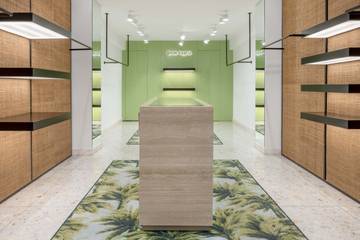 Für den Laden in zentraler Lage kooperiert die Marke mit Simple Caracters Group, einem Spezialisten für den griechischen Modehandel, teilte Palm Angels am Freitag mit. Der Store ist in zwei Räume, die hintereinander liegen, aufgeteilt. Für die Einrichtung setzt Palm Angels auf für die Marke typische Elemente wie Edelstahlregale, Marmorplatten und botanische Design-Elemente – so ist die Rückwand in einem hellen Grün gehalten und den Boden zieren mehrere Teppiche mit Palmen-Prints.