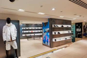 Die Shop-in-Shop-Fläche, die Teil der Herrenabteilung im Untergeschoss ist, fungiert sowohl als Verkaufs- als auch Ausstellungsraum, inspiriert von der "städtischen Umgebung und dem kulturellen Wandel der Mode". Einflüsse, die die Marke für eine wachsende Nachfrage nach modischer Sportbekleidung verantwortlich macht. Sie präsentiert ihre kuratierten Schuhkollektionen auf rohen Stahlplatten und weiß getünchten Regalen.