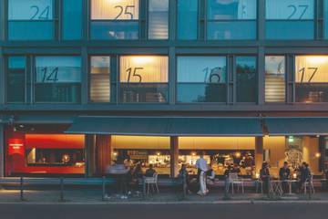Ab acht Uhr morgens können die Gäste auf der Terrasse oder im Innenbereich Platz nehmen. Minimalistische Metall-Stühle säumen den Gehweg vor dem Hotel, das Interieur ist klassisch schwarz-weiß und wird mit modernen Lampen und Tischnummern kombiniert.