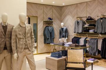 Die neu gestaltete Verkaufsfläche wurde in warmen Naturtönen und mit viel Holz und Messing gestaltet und zeigt das gesamte Produktportfolio der Marke, von Anzügen, Sakkos und Mäntel über Strickwaren bis hin zu Hosen und Hemden.