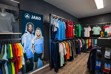 Zum Sortiment gehören vom Vereinssport über Running- und Fitness-Artikel bis hin zur Jako Corporate Teamwear. Der Store umfasst 65 Quadratmeter und bietet darüber hinaus auch eine eigene Druckerei für das Bedrucken von Teamkleidung.
