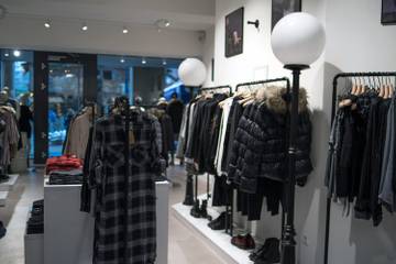 Vorlage bei der Entwicklung des Shop-Designs waren der Messestand auf der Panorama Messe in Berlin und der urbane Stil des Münchner Showrooms von Herrlicher. Die hellen Räume mit den weißen Warenträgern und hängenden Regalsystemen aus verzinkten Rohren sorgen für einen industriellen Look. Die Erweiterung um eine zweite Etage ist derzeit in Planung.