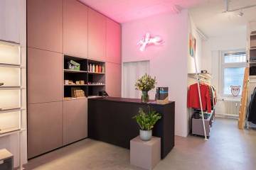Der Laden im Frankfurter Oeder Weg 51 präsentiert sich in einem reduzierten Design, ein pinkes Licht setzt in der sonst weiß und grau gehaltenen Einrichtung Akzente. Glore bedient die steigende Nachfrage nach Mode, die mit Rücksicht auf die Umwelt und unter fairen Arbeitsbedingungen hergestellt wurde.