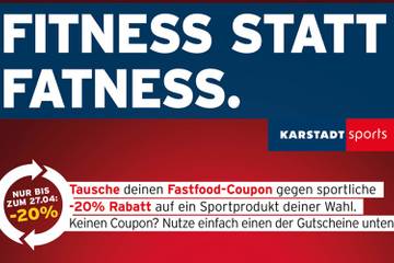 Karstadt sports startete am Freitag die Motivationskampagne „Fitness statt Fatness“: Bis zum 27. April können in 28 Sporthäusern Fast-Food-Gutscheine eingelöst und in Rabatte auf das gesamte Sportsortiment umgemünzt werden. Sportbegeisterte und alle die es werden wollen können beliebige Fast-Food-Coupons bei Karstadt sports einlösen und bekommen 20 Prozent Nachlass auf einen Artikel seiner Wahl.