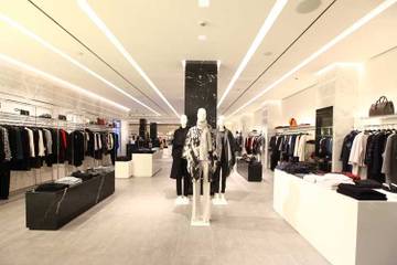 1996 gegründet, konzentriert sich das libanesische Familienunternehmen auf deutsche Mode. Marken wie Steffen Schraut, Marc Cain, Oui und Drykorn gehören zum Sortiment des neuen Stores. Er setzt gleich beim Antritt ein Statement: Im ebenerdigen Eingangsbereich befindet sich lediglich ein großzügiges Schaufenster, schlicht und modern. Über eine aufwendig gearbeitete Marmortreppe gelangt man in das fünf Meter tiefer gelegene Verkaufsgeschoss. Dort öffnet sich eine Welt aus kühlen und glatten Materialien in frischem und elegantem Ambiente. Der Store zeigt sich als ein großer Raum, in dem die einzelnen Marken in ihren eigenen Themenwelten betont werden. Weißer und schwarzer Marmor, polierter Edelstahl, Glas und Leder sorgen zusammen mit einem aufwendigen Lichtkonzept über offene Deckenschlitze für eine edle Einkaufsatmosphäre.