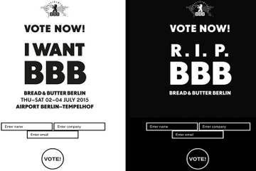 Bread & Butter-Chef Karl-Heinz Müller kämpft und kämpft. Pünktlich zum Beginn der Berliner Fashion Week heute, haben alle, die die Bread & Butter lieben oder hassen, die Chance über ihre Zukunft mitzubestimmen. “I want BBB” oder “R.I.P. BBB” – die Branche entscheidet selbst, ob es vom 2. bis 4. Juli 2015 eine Rückkehr der Messe geben wird oder nicht. In wenigen Tagen wird das Ergebnis bekanntgegeben.