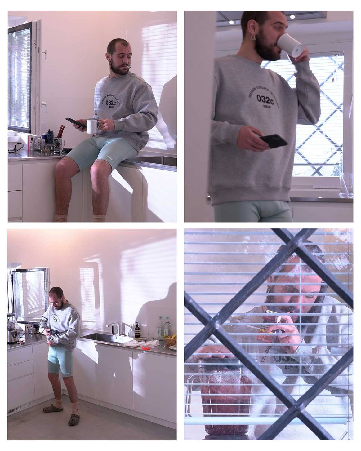 Das Berliner Label und Magazin 032c präsentiert seine neue Kollektion aus der Selbstisolation. Dafür hat sich dessen Fashion Director Marc Goehring von Fotograf Timothy Schaumburg in 13 Szenen ablichten lassen, die ihn in unterschiedlichen Alltagssituationen zeigen.