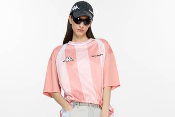 Zu den wichtigsten Teilen gehören das mit Flammen bedruckte Fußballtrikot in Rosa mit den Logos von Kappa und Acne Studios, die ausgewaschenen Denim- und Trainingshosen mit dem Kappa-Logo an den Beinen und die enganliegenden T-Shirts, die an die feuchtigkeitsableitenden Basisschichten der Fußballspieler:innen erinnern.