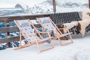 Im Skigebiet Hochzillertal-Kaltenbach in Österreich hat Guess Gondelbahnen, das Hotel ‘Die Wedelhütte’ sowie ein Restaurant mit Wohnaccessoires ausgestattet, die das Logo der Marke ziert.