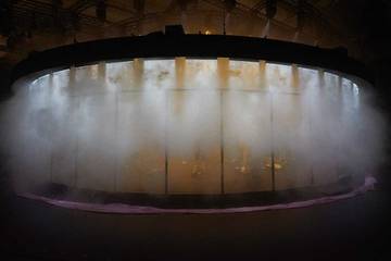 Der Backstage-Bereich war mitten in den Saal gelegt worden und drehte sich unter den Klängen des "Boléro" von Maurice Ravel vor den Zuschauerrängen. Durch eine Plexiglaswand ließ sich beobachten, wie die Models von den Anziehhilfen ihre Outfits angelegt bekamen. Fertig gestylt stellten sie sich schließlich vor dem Publikum auf.