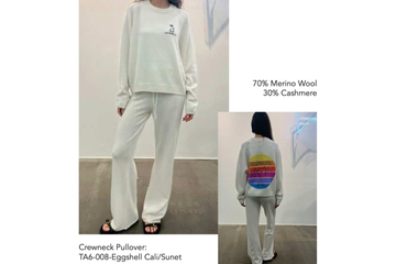 Neben klassischen Farben wie „Eggshell“, „Huskey“ und „Ivory“ gibt es auch Gelb-, Pink- Blau- und Grüntöne. Eine bunte Palmenstickerei setzt auf dem Rücken der Pullover Akzente.