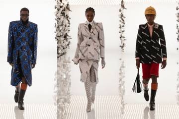 Mit Hosenanzügen aus Samt in Petrol und Marineblau, Anzügen für Frauen mit Seitenschlitzen am Rock, die bis zum Oberschenkel reichen, sowie Anzügen, die vollständig mit Pailletten bedeckt sind, sind die Schnitte ein Höhepunkt. Das Flora-Muster der Marke ist auch als ganzflächiges Motiv auf einem Anzug mit zusätzlichem Balenciaga-Schriftzug zu sehen.