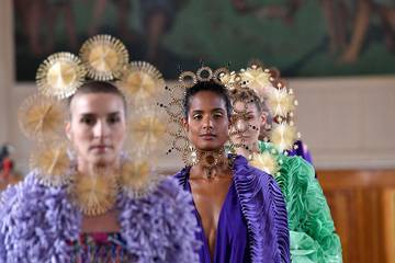 Jeder seiner 21 Looks zeigte einen spektakulären Heiligenschein aus sonnenförmigem Stroh und Metallschmuck der einheimischen Künstler Antonio Rendon Cornelio und Carlos Piedras.