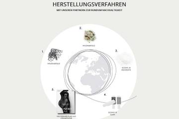 Grünes Denken und Handeln stehen für das Unternehmen Kunert, das bereits 1991 seine erste Ökobilanz veröffentlicht hat, im Vordergrund. Für die neue Blue Kollektion setzt der Strumpfspezialist für den kompletten Prozess auf starke Partner. So stammt das verwendete Garn von Econyl, das zu 100 Prozent aus regenerierten Abfällen wie Fischernetzen und anderen Nylon-Wertstoffen besteht. Die Papierherstellung übernimmt die innovative Papierfabrik Gmund, die mit der Umwelt Charta als erste einen neuartigen Umweltstandard festgelegt haben.