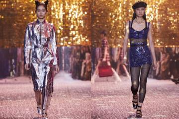 Die Show begann mit einem Metallic-Hosenanzug und setzte viele weitere Pop-Akzente: Leoparden-Print, Silber, Allover-Karos in Pink-Tönen, ein transparenter Regenmantel, Pailletten, Neon-Gelb und -Pink und einige Looks ganz in Schwarz. Und während die Designs zu den Klassikern des Hauses zurückkehrten - schmale Taille und ausgestellter Tüllrock, Bar-Jacke, Bluse - schrumpften die Längen zu einer kurzen Silhouette von plissierten oder Trapez-Shorts und Mini-Röcken.