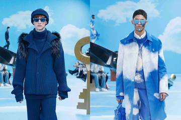 Ein Teil der Kollektion ist mit einem Wolkenmuster auf einem blauen Himmel verziert, das den Ton des Dekors wiedergibt. Der CEO der LVMH-Gruppe Bernard Arnault, sitzt bei der Show in der ersten Reihe neben seinen Söhnen. Auch auf einem Top von Bella Hadid, die ihren Mantel fallen ließ, um ein blaues Louis Vuitton-Büstier zu enthüllen, findet sich das Muster wieder.
