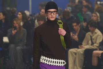 Der Höhepunkt des dritten Tages der Mailänder Männermodewoche, bei dem minimalistische Eleganz mit einem Hauch von Farbe verschönert wurde, fand in der Prada Foundation auf einem gläsernen Boden statt, der eine herbstliche, mit gelben Blättern übersäte Landschaft zeigte, während die Gäste auf Bürostühlen saßen.