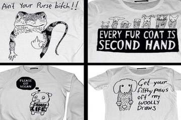 "Get your filthy paws off my woolly draws", "your killer look ain't worth dying for" und "don't buy products tested on animals" sind nur einige der frechen Slogans der neuen T-Shirts. Black Score-Designer Simeon Farrar zeichnete die schrulligen Tiermotive der Kollektion per Hand, inspiriert von Petas Motto: 'Tiere sind nicht für uns zum Essen, Tragen, Herumexperimentieren, als Unterhaltung oder jegliche Misshandlung da.'