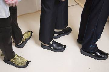 Schlammschutz-Details aus Gummi, die Oberteile für eine schützende Allwettertauglichkeit umschließen, konnten über formale und lässige Kategorien hinweg beobachtet werden. Gestülpte und hohle Sohlen verleihen einfachen Canvas-High-Tops oder klassischen Halbschuhen ein aussagekräftiges Gefühl, schaffen klobigere Profile und führen zu interessanten Kontrasten von matt/glänzend und strukturiert/glatt.