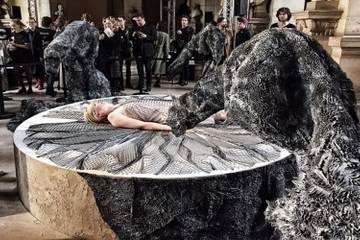 Während der Show auf der Paris Fashion Week lag die Schauspielerin Gwendoline Christie, die aus dem Film Game of Thrones bekannt ist, auf einem großen Rondell. Neben ihr waren drei Roboterarme installiert, die live vor den Zuschauern das maschenartige Kleid ausdruckten, das ihr um den Körper drapiert war.
