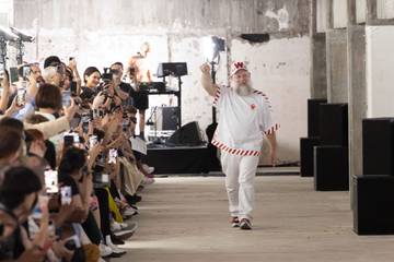 „Diese Passage erzählt von allem, was in der Welt von heute falsch läuft“, erklärt Walter Van Beirendonck. Während ich meine Kollektion entwarf, wurde ich von all den Dingen erschüttert, die wir durchmachen (die Pandemie, die Umweltkatastrophen aufgrund des Klimawandels, die Kriege), und vor allem fühlte ich, dass die Mode auch ein Schlachtfeld ist. Ich weiß, dass einige Leute vielleicht schockiert oder beleidigt waren, aber es ist das Privileg eines Künstlers, ein solches Statement abgeben zu können. Ich sehe es als eine Performance am Ende meiner Fashion Show.“ Seit 2022 hat sich der Designer von der Königlichen Akademie der Schönen Künste in Antwerpen zurückgezogen.